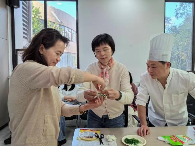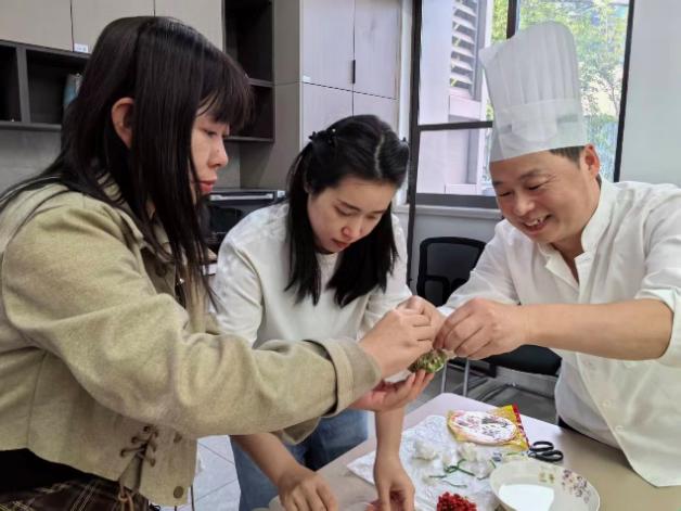 演示一遍之后,学员老师们迫不及待地开始亲手实践,尝试制作自己的富贵石榴球,活动现场热闹非凡。虽然初次尝试难免会遇到一些困难,但在潘大厨的耐心指导和鼓励下,大家逐渐掌握了技巧,一个个精美的富贵石榴球逐渐呈现在眼前。