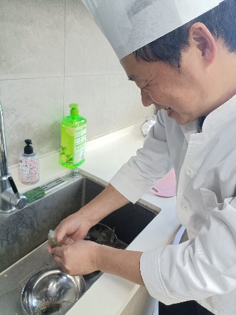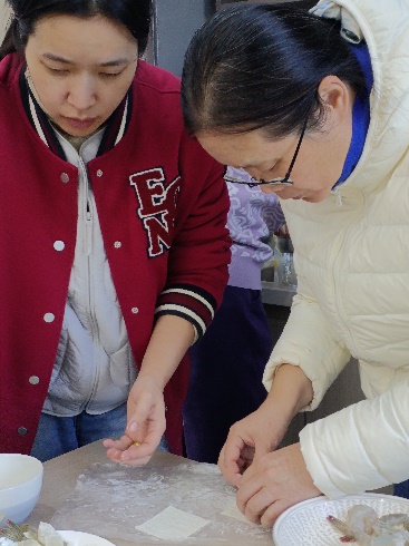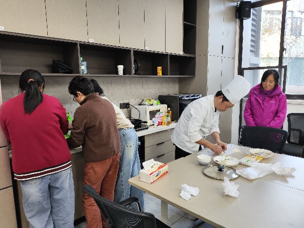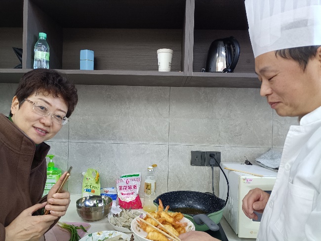 在实操环节,大家纷纷动手,按照指导有条不紊地操作起来。“虾头虾壳要去掉,只留虾尾,开背去虾线才能更入味”,“腌制时加少许料酒和胡椒粉,既能去腥又能提鲜”,“馄饨皮要裹紧,炸制时油温控制在六成热左右最佳”,潘大厨穿梭在各个小组之间,耐心解答大家的疑问,手把手纠正操作中的问题。有的老师初次处理虾,动作略显生疏,在同伴的帮助和师傅的指导下逐渐熟练;有的则发挥创意,在酱汁中加入少许辣椒粉,让味道更加醇厚。厨房里,此起彼伏的交流声、油锅里的滋滋声交织在一起,充满了烟火气与欢乐氛围。