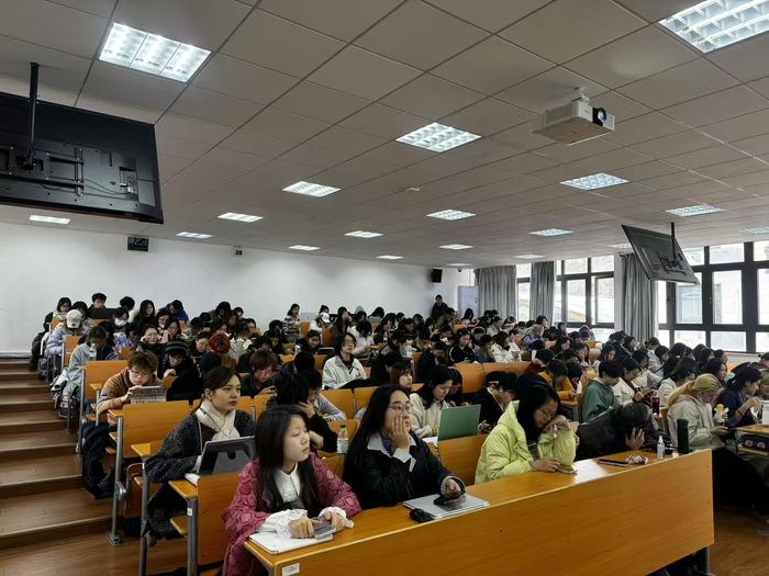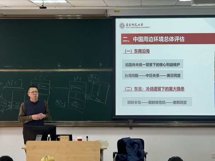 2025年12月10日13:00,华东师范大学设计学院于干训楼阶梯教室举行了一堂主题为《携手周边国家共创美好未来,推动构建新型国际关系》的形势与政策课讲座。本次授课由马克思主义学院何明老师主讲,面向设计学院2024级与2025级全体本科生,现场座无虚席,气氛庄重而热烈。