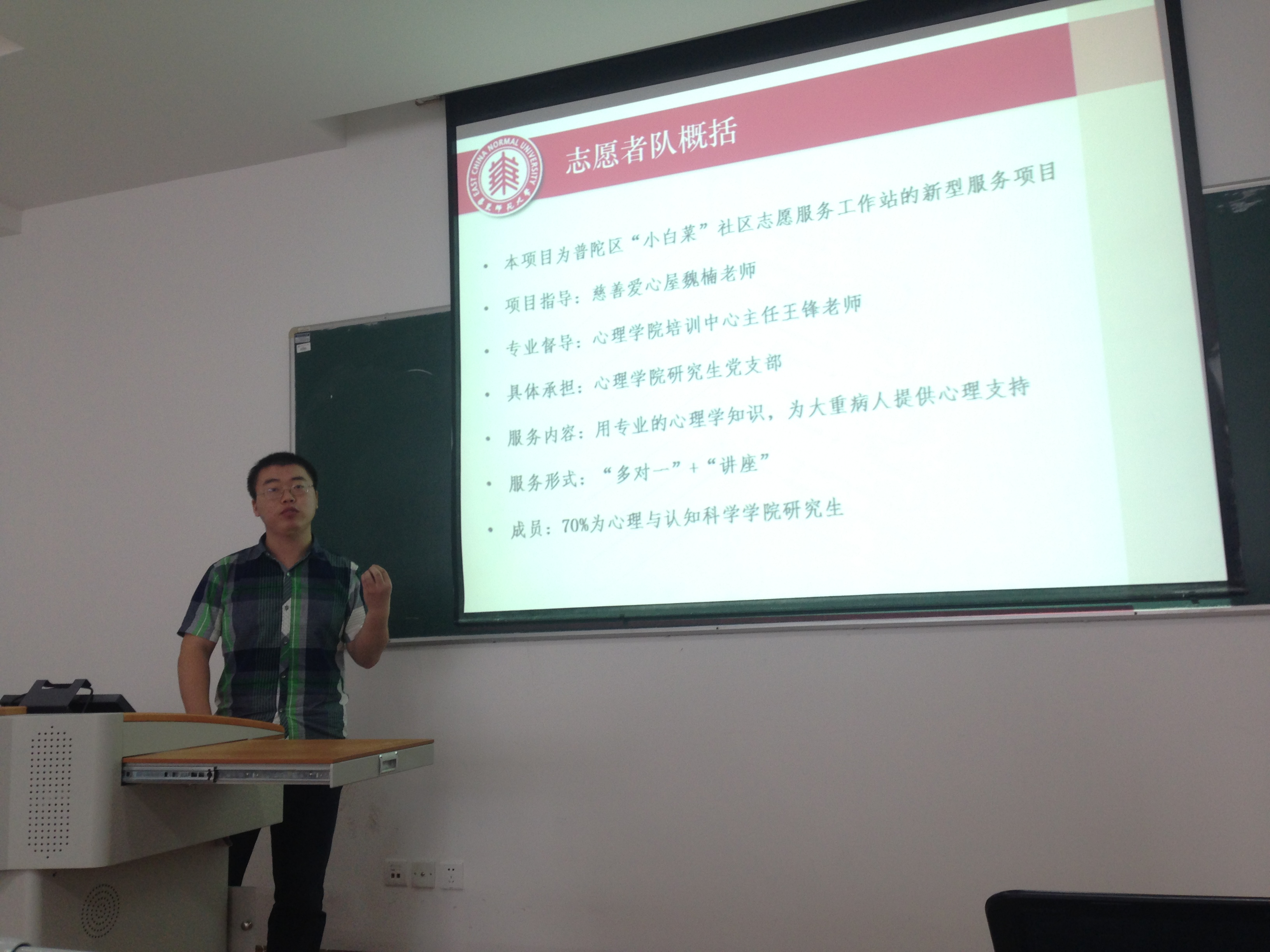 最后,丁培书学长以精心准备的PPT和演讲,为大家讲解和展示了“大病慰藉”项目的开展情况以及未来的发展方向。“大病慰藉”是学院研究生支部长期进行的社区志愿服务项目,其服务对象为患有大重病的社区居民。志愿者主要是为这些服务对象提供心理辅导和陪伴的服务,从而帮助他们以更好的心理状态面对生活。