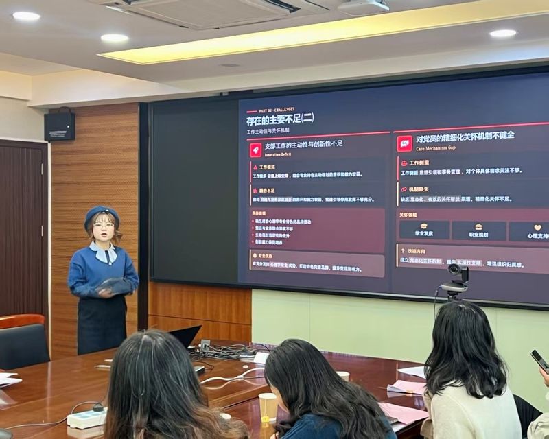 2024级专业学位硕士研究生党支部书记戴琳霏围绕深化理论武装、规范党员发展等方面,总结了支部工作开展情况。支部严格落实“三会一课”与主题党日制度,紧扣国家重大时事政策和党中央最新精神,组织开展专题学习和宣讲活动,持续强化思想引领;同时稳步推进党员发展工作。针对支部工作主动性与创新性不足、党员关怀机制尚不健全等问题,戴琳霏表示未来将立足心理学专业优势,探索打造特色党建品牌,健全常态化关怀支持机制,切实为党员提供有温度、有实效的服务,不断增强支部凝聚力和党员组织归属感。