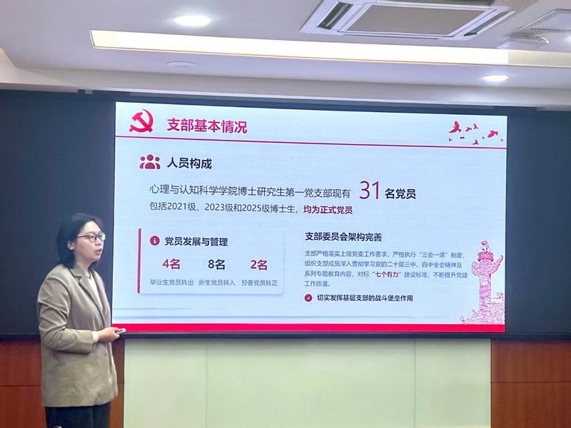 博士研究生第一党支部书记邱诗苇从强化理论武装、严抓作风建设、创新组织生活等方面,对支部工作情况进行了汇报。支部坚持以 党纪学习教育为抓手,通过专题学习、联建党课、集中研讨等方式,持续强化理论引领、夯实思想根基、加强作风建设。在此基础上,支部注重打造具有研究生特色的组织生活,举办“无界”研究生论坛,邀请经验丰富的教师和研究生,结合科研与成长实践,共话时间管理与生涯规划;开展“廉心洁行”廉政心理科普展,以心理学视角深化廉洁教育。邱诗苇表示,未来支部将立足博士研究生培养特点,进一步增强支部凝聚力与向心力,加强对博士研究生学业成长和心理健康的关注与支持,推动党建工作提质增效、走深走实。