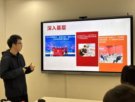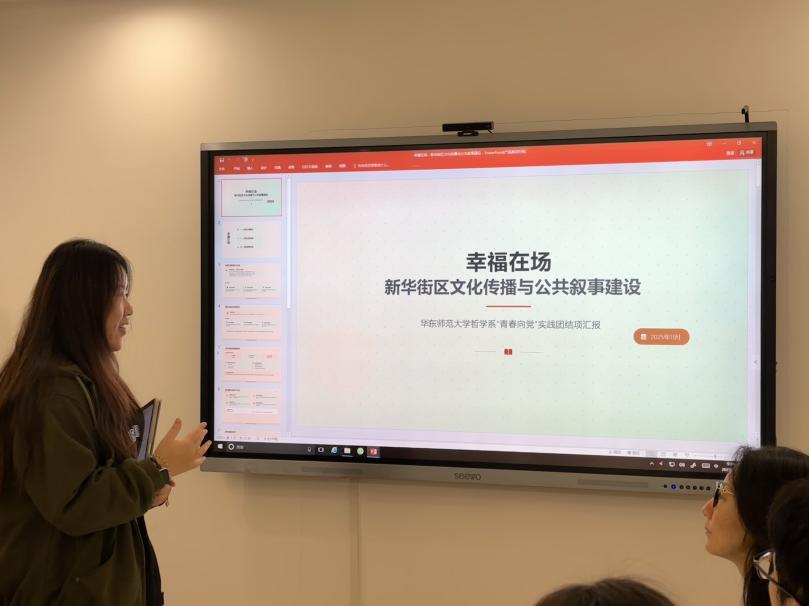 本次发展对象组成的“青春向党”实践团以“幸福在场·新华街区文化传播与公共叙事建设”为主题开展社会实践,由队长朱梦妍同学作为代表进行汇报。该项目通过深度走访与图文记录,挖掘街区商户的暖心故事与文化底蕴,联合街道共同策划出新华路重点街铺宣传手册。项目成果既提升了店铺的公众关注度与社区凝聚力,也使同学们在社会调研、跨校协作与知识转化等综合能力上得到了有效锻炼。