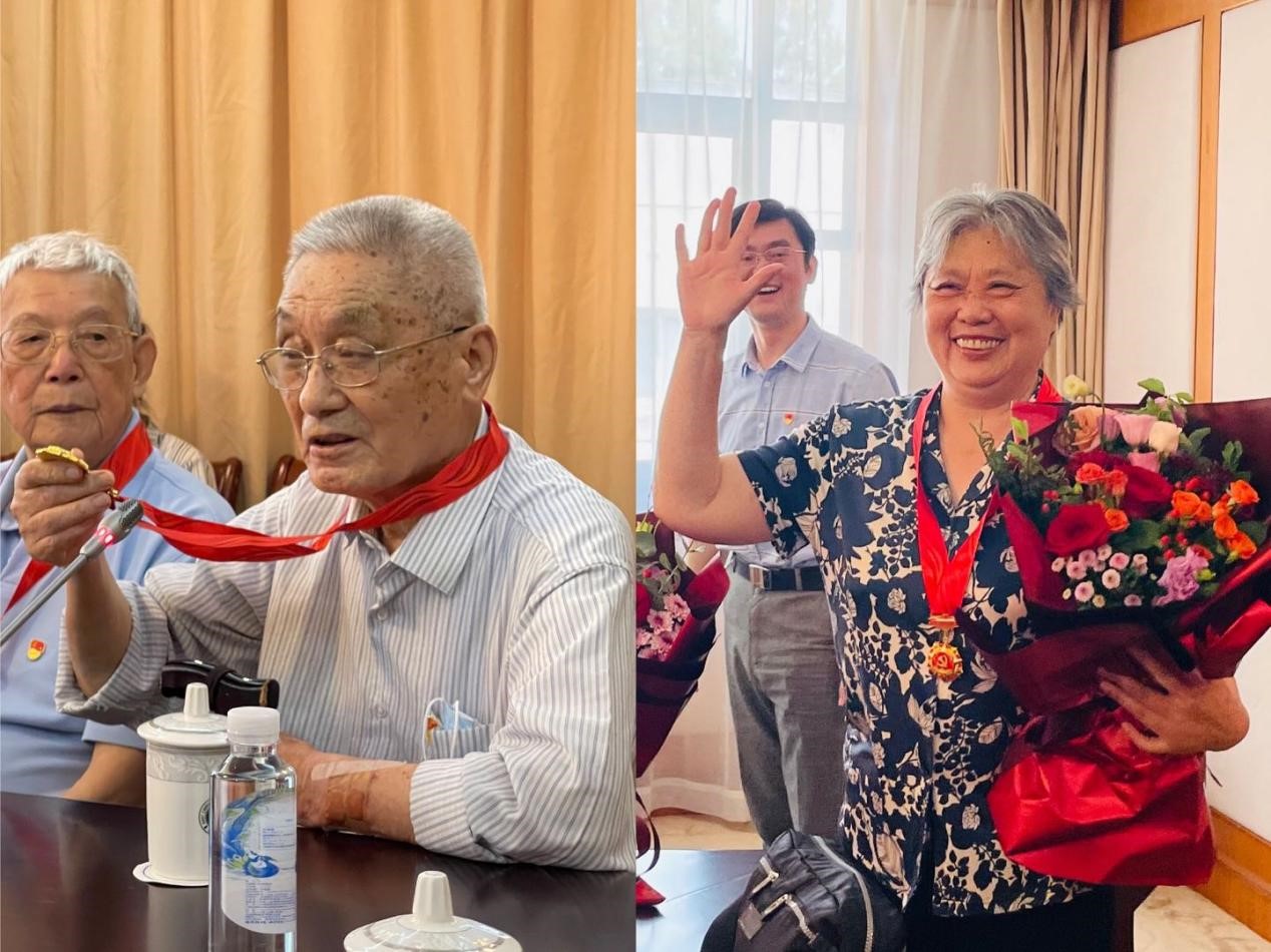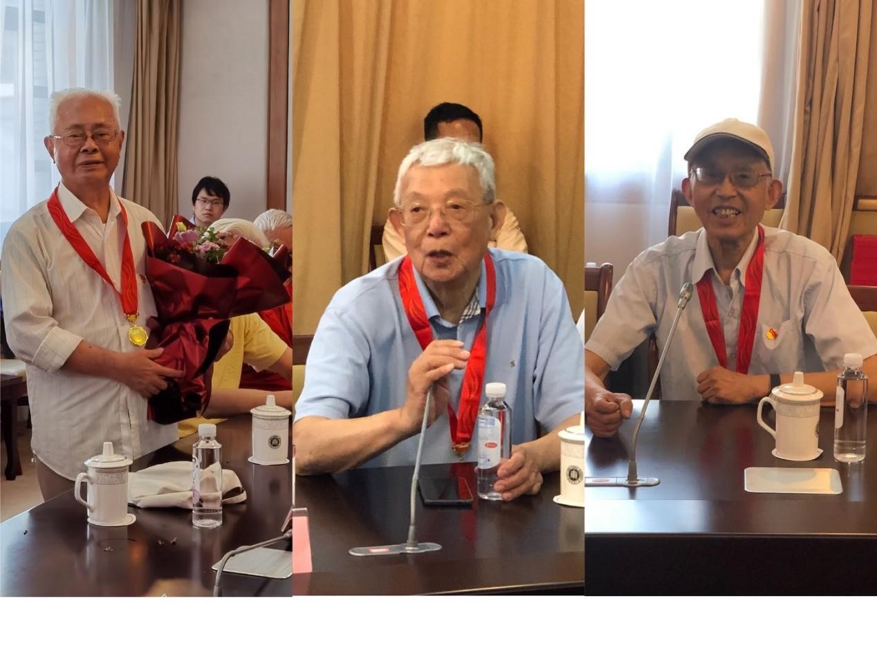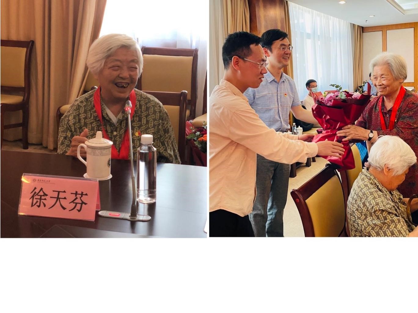 接过纪念章,各位老党员分享了自己的感受。已经92岁高龄的徐天芬教授指出,没有共产党就没有新中国,今天的幸福生活离不开中国共产党的百年奋斗。经历了过去的苦,尝到了现在的甜,更加坚定信心,永远跟党走。党龄已经67年的姚金兰老师激动地说:“党给了我一切。”她对比了孩提时感受到的共产党与国民党的区别,回忆了自己儿时在家庭困难和入伍参军时受到组织的关心,一步步成长的历程,由此强调“作为一名老党员,内心感到无比骄傲和自豪,谢谢党组织对自己的关爱,我将始终保持政治本色。”作为华东师大建校的第一批新生,何应灿教授深情地说,从1951年起,自己在师大学习、工作、生活了70年,对师大感情至深,为了参加今天的仪式,特意穿了一件鲜红的系服,何老师表示愿意把自己的一切都献给党的教育事业。曾经获得校优秀共产党员的李荣兴教授回顾了自己入党的经历以及在师大工作的时光,他说:“虽然从意气风发的少年到耄耋老人,但是人虽老,心未老,自己还是曾经那个少年。这枚纪念章是对自己的鞭策,一定会不忘初心,牢记使命。”