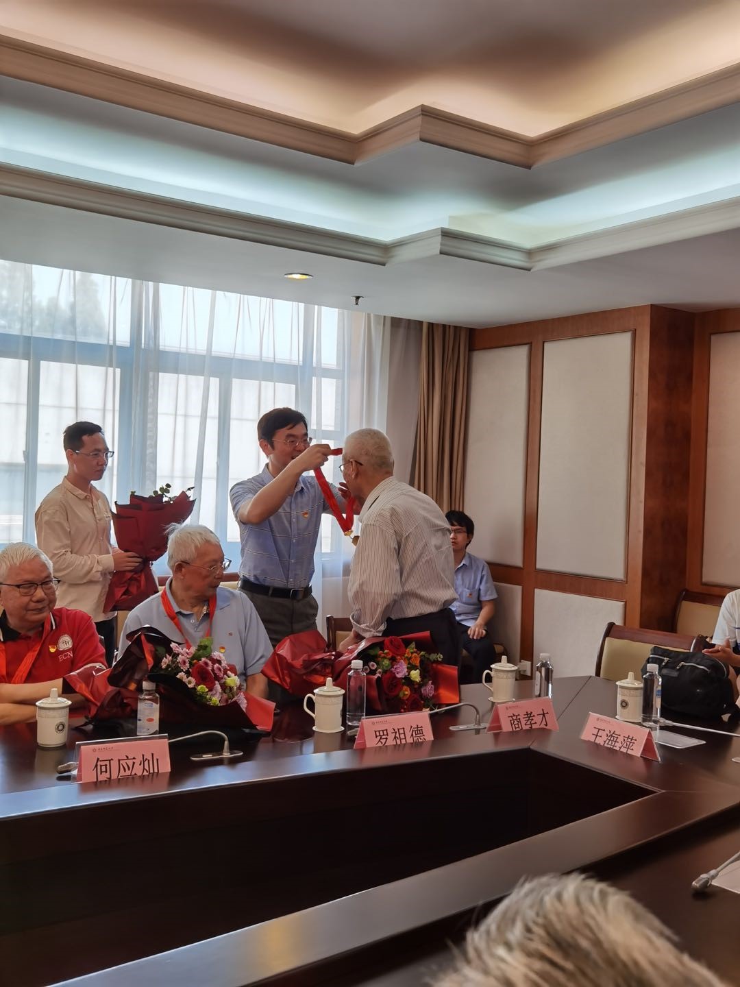 颁发仪式在欢快的音乐声中拉开帷幕,系党委书记王柏俊依次来到到场的九位老党员身边,为他们颁发并佩戴“光荣在党50年”纪念章,随后,学生代表为老党员们献上鲜花,对他们表达祝福与谢意。老党员们仔细端详着、用手触摸着纪念章,嘴角绽放笑容,脸上洋溢着幸福和骄傲。一枚纪念章,是荣誉,是肯定,是致敬,更是感谢。