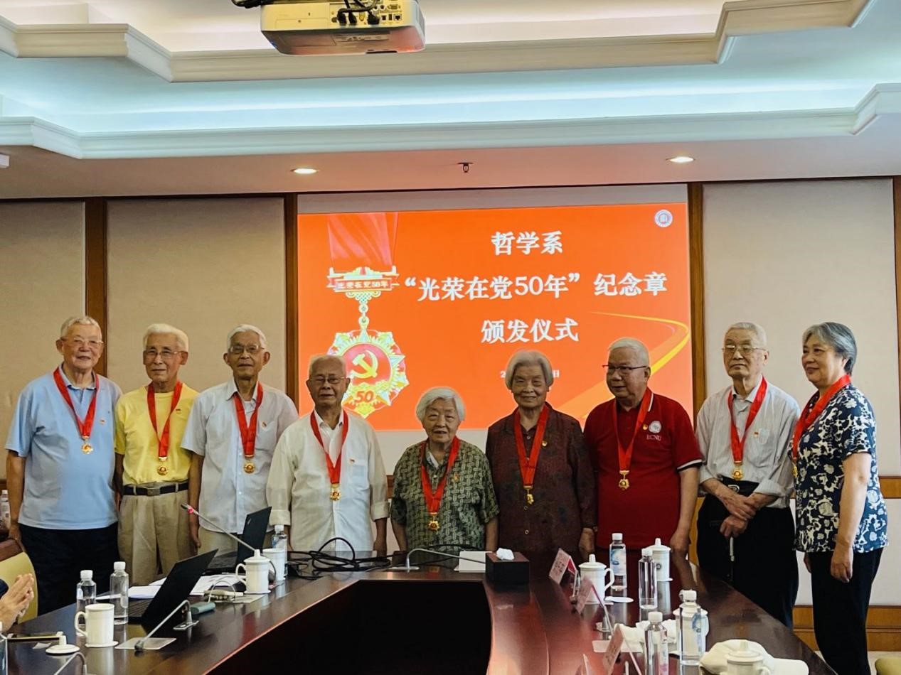 哲学系共有徐天芬、姚金兰、何应灿、王龙道、李荣兴、包连宗、罗祖德、张天飞、商孝才、朱新轩、王海萍等11名老党员获得“光荣在党50年”纪念章。这些老党员中,党龄最长的67年,最短的50年,他们兢兢业业为了党和国家的教育事业忠诚奉献了一生。